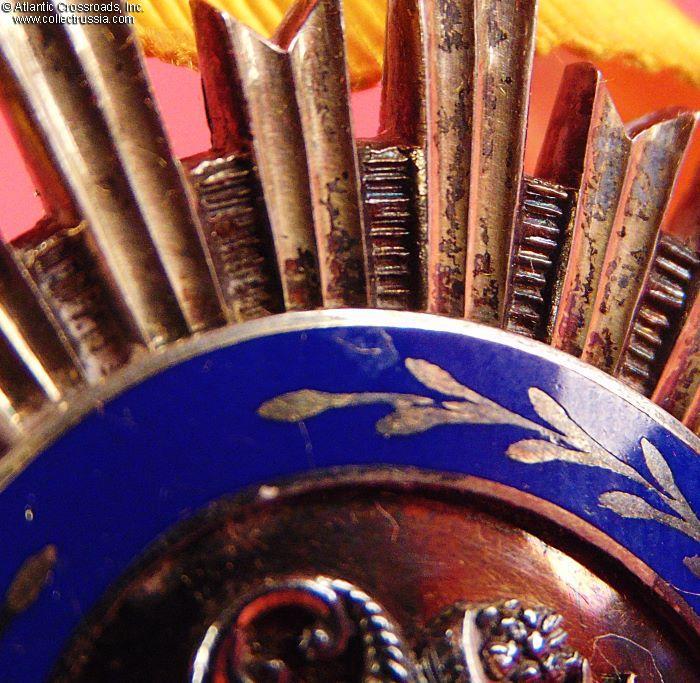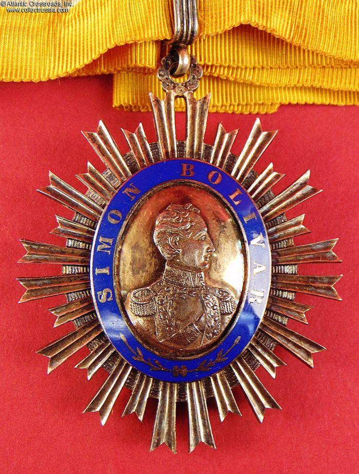 Neck badge with ribbon. Silver gilt, enamel, 62.3 mm in height (incl. eyelet), 50.1 mm in width, weighs 38.1 g. The bust of Simon Bolivar in the center medallion is in silver on silver gilt background, encircled by his name in gold on blue enamel. The center medallion on the reverse features the coat of arms of Venezuela, superimposed on a silver gilt background, resting on a ribbon inscribed with "15 DE AVRIL 1810 LIBERTAD 5 DE JULIO 1811." The badge is in very fine to excellent condition, showing mild attractive patina to the metal and a tiny spot of probably glue on the blue enamel at 12:05 o'clock, visible only when tilting the badge to reflect a bright light. The neck ribbon is moiré silk, 18.5" long with silk ties. It is rather frail, especially in its middle part, and shows a hole to the left of the suspension loop. About 2" to the right of the loop, there is a complete tear across the ribbon. The ribbon's condition makes it unfit for wearing but it will display nicely, properly arranged.