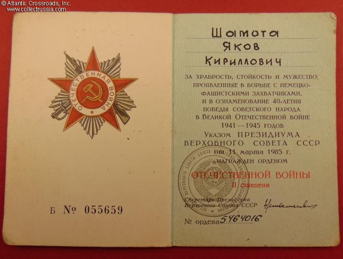 Order of the Patriotic War 2nd class, Type 3, #5464016, with a document, issued in 1985 to Yakov Shamota (Яков Кирилович Шамота).
