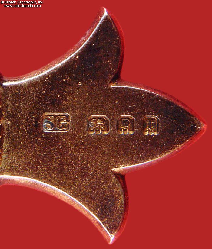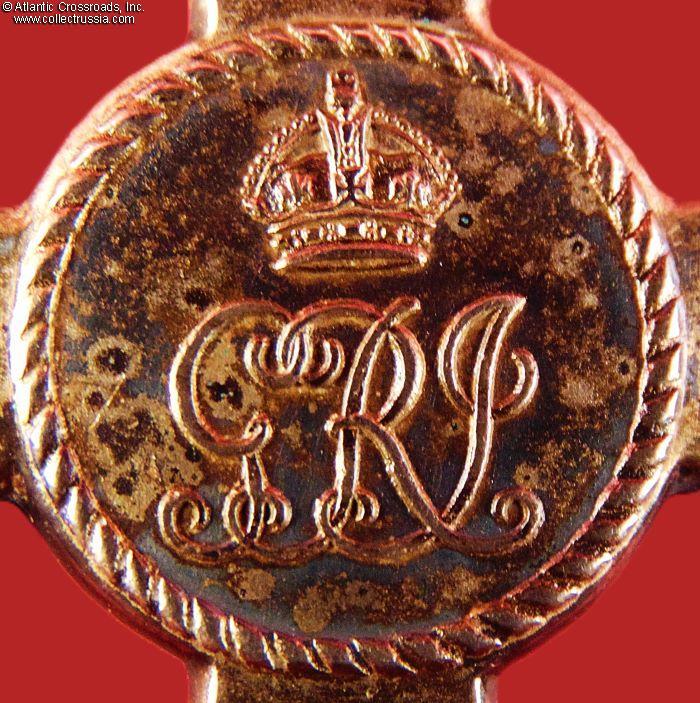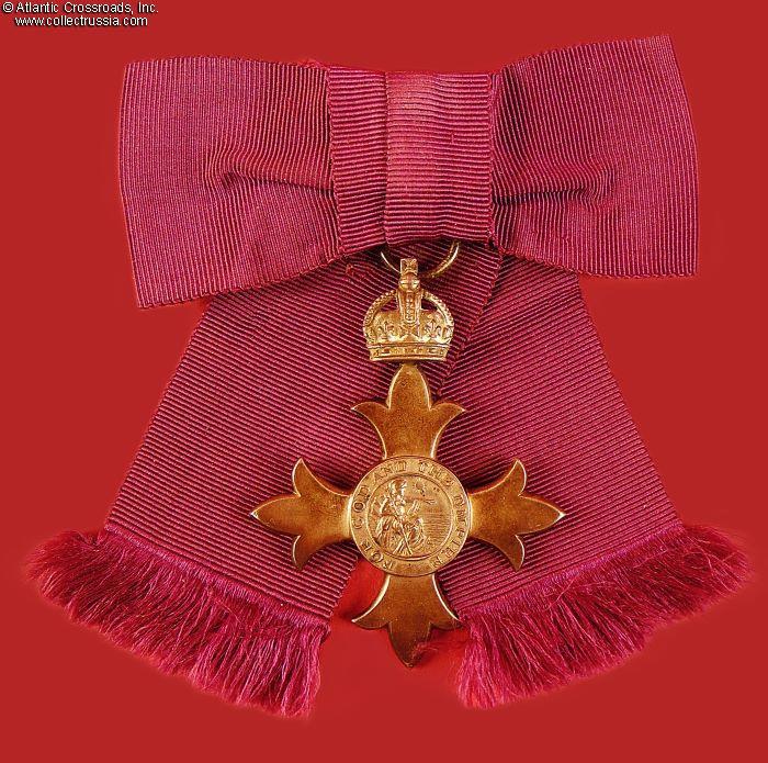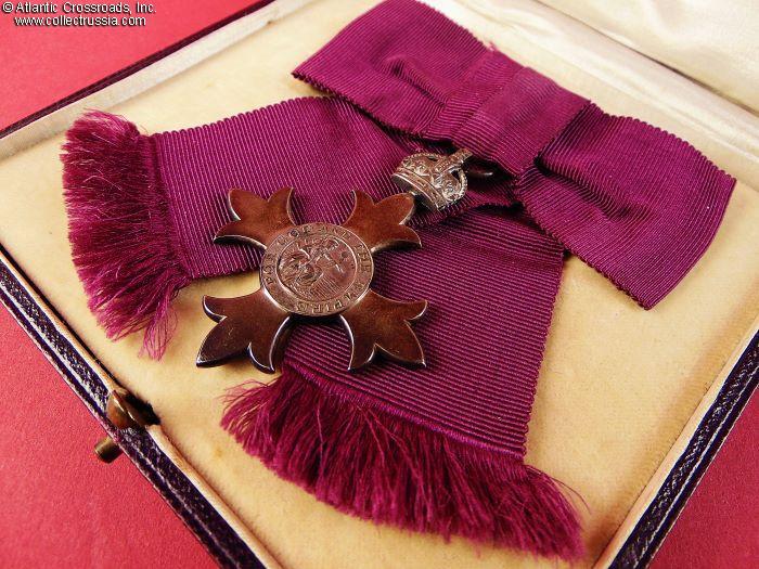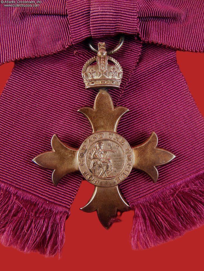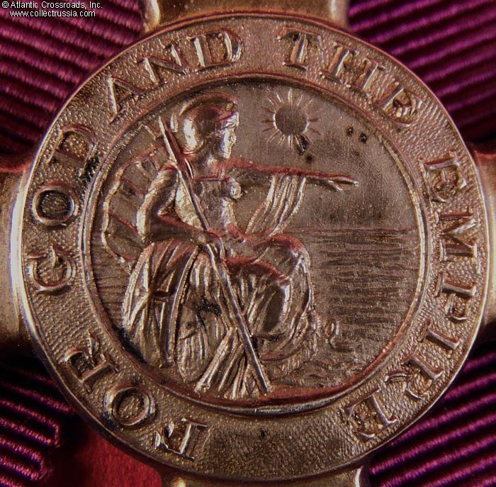 The Badge. In silver, 64.2 mm in height (incl. eyelet), 49.7 mm in width. Suspended from a lady's bow in plum-colored silk. The absence of the red stripe in the middle of the ribbon denotes civil division. The obverse center medallion has the image of Britannia, encircled by the inscription FOR GOD AND THE EMPIRE. The reverse center medallion shows the royal monogram under the crown. The 6 o'clock arm of the cross is maker marked, with "SG" standing for Seamus Gill. The link ring of the badge is sewn onto the bow under the knot. The pin attachment is sewn onto the knot in the back. Both the badge and bow are in excellent condition. The badge shows mild attractive patina on both sides. The ribbon of the bow is near-pristine. The pin attachment is in perfect working order.