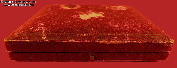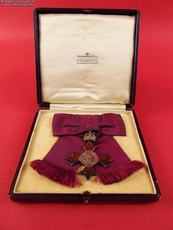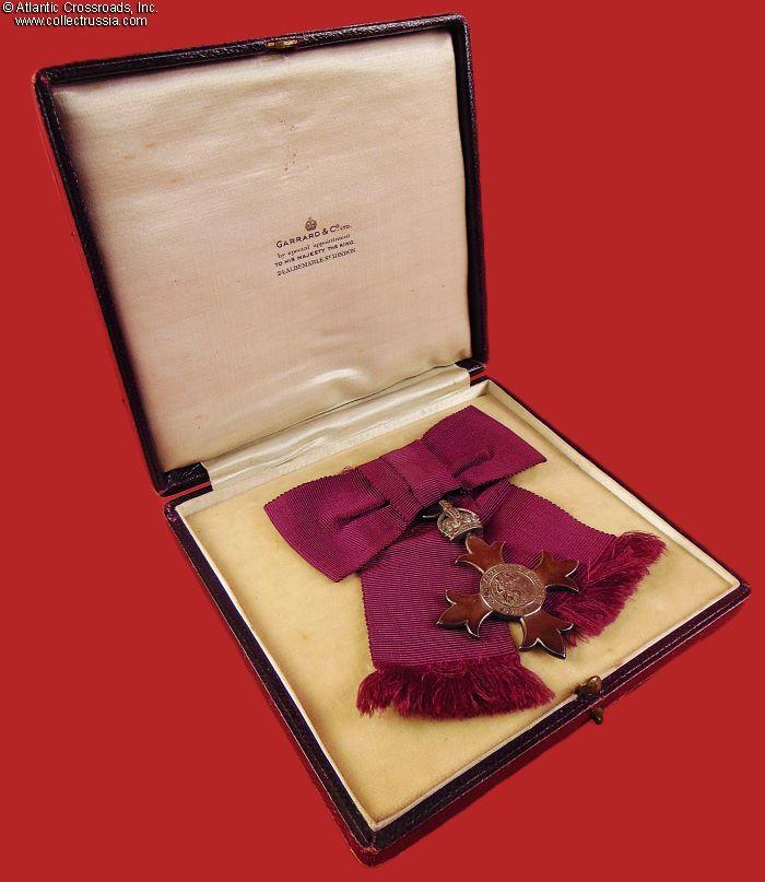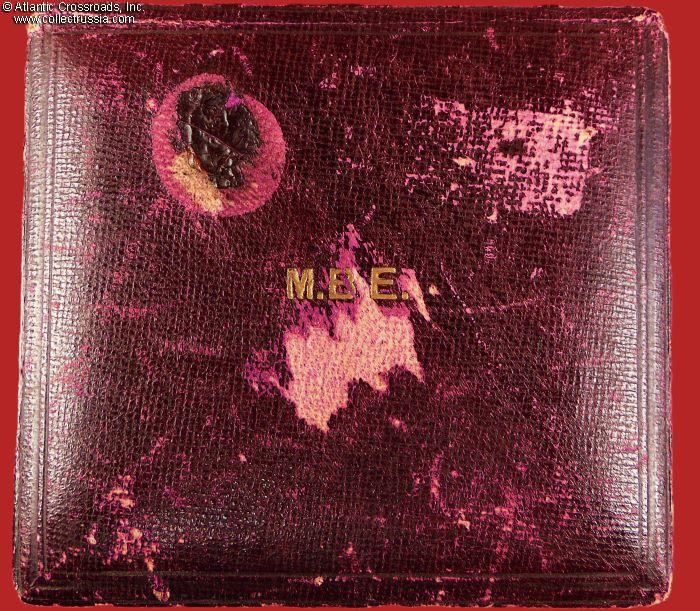 The Case of Issue is in wood, wrapped in leatherette on the outside. Made by Garrard & Co., Ltd., London. The fitted space inside is lined with champagne-colored short-pile velvet; the lid is lined with similar colored silk with the manufacturer's trademark in the middle. In good to very good condition. The leatherette of the lid shows considerable wear, however the embossed letters M.B.E., abbreviation for Member of the Order of the British Empire, are intact and retain most of their original luster. The box is structurally sound, both hinges are tight and strong, the lid sits perfectly on the bottom part, and the latch is in great working condition.