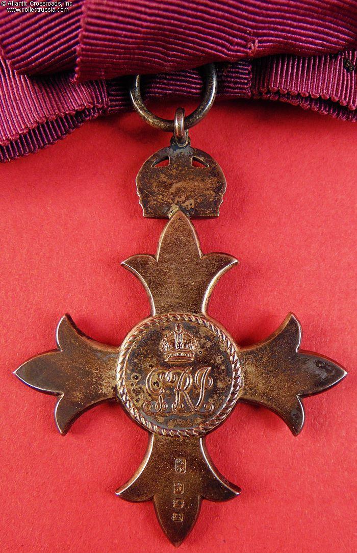 The Badge. In silver, 64.2 mm in height (incl. eyelet), 49.7 mm in width. Suspended from a lady's bow in plum-colored silk. The absence of the red stripe in the middle of the ribbon denotes civil division. The obverse center medallion has the image of Britannia, encircled by the inscription FOR GOD AND THE EMPIRE. The reverse center medallion shows the royal monogram under the crown. The 6 o'clock arm of the cross is maker marked, with "SG" standing for Seamus Gill. The link ring of the badge is sewn onto the bow under the knot. The pin attachment is sewn ont