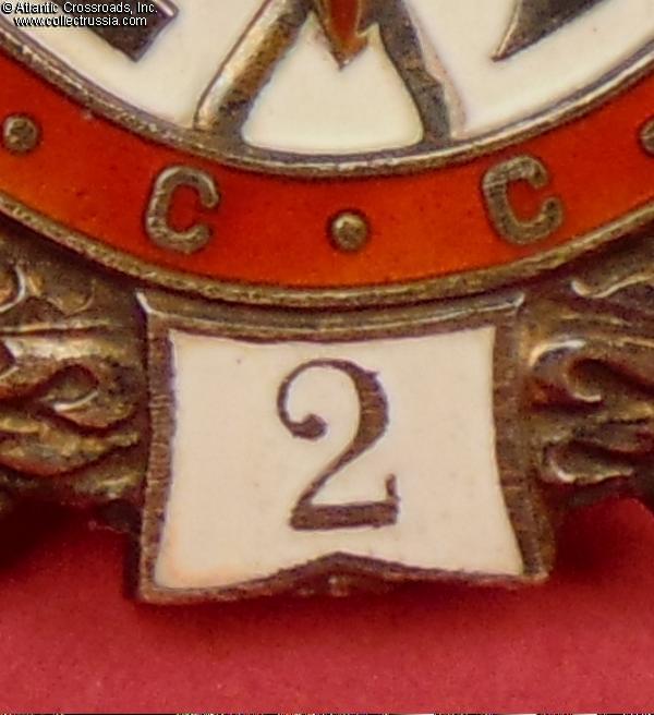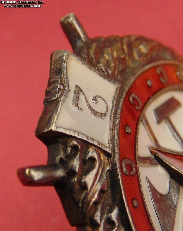 Silver, enamels; measures 45.0 mm in height (from the bottom of the plaque to the top of the eyelet), 37.2 mm in width; weighs 26.1 g without the suspension and connecting link. This early suspension-type piece was manufactured at the Krasnokamsk Mint in 1945. It features a relatively sharp plow, thin hammer head and straight mint mark. The currently known serial number range for this version is 8551 - 11000. /V. Durov, N. Strekalov, The Order of the Red Banner, p. 142/.