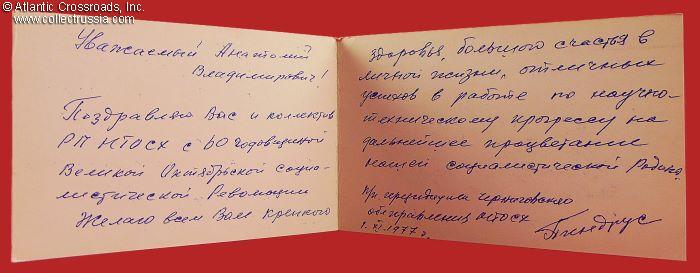 In folder format, measures 5 ½" x 3 ½", unmailable without a cover; published by the ART Publishing House, Kiev. The inscription inside is dated 1 November 1977 and contains well wishes to an employee on occasion of the 60th anniversary of the October Revolution.