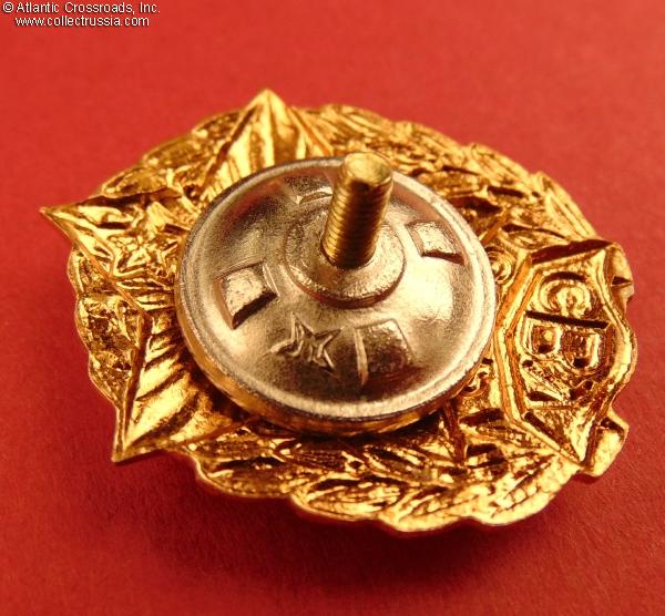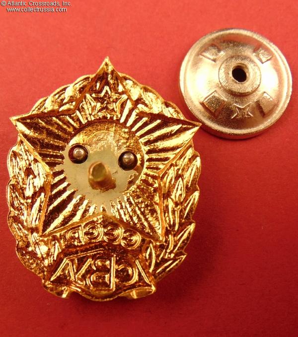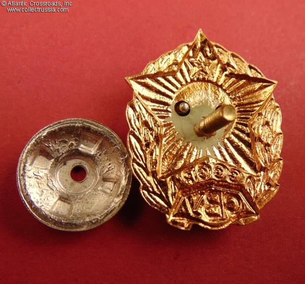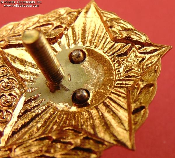 Brass, enamels, lacquer. Measures 34.9 mm in height, 27.7 mm in width. Riveted two-piece construction. Features very distinctive semi-spherical rivets, hot-baked enamel on the red star and plaque, coat of lacquer on the background of the central medallion, and higher overall quality than most other versions.