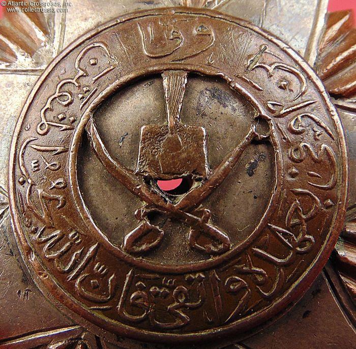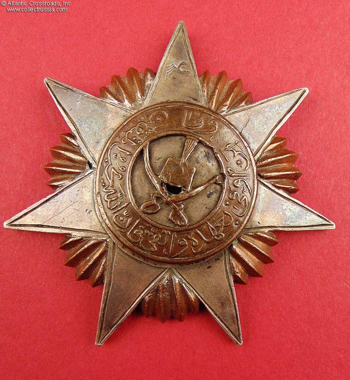 In silver and bronze, 65.6 mm in height, 66.0 mm in width, weighs 63.3 g. The center medallion with Karakul hat and crossed sabers is encircled by an inscription in Arabic. The top ray of the star displays the numeral "4" in Arabic, denoting the class of the award. The reverse is plain, with a horizontal suspension bar.