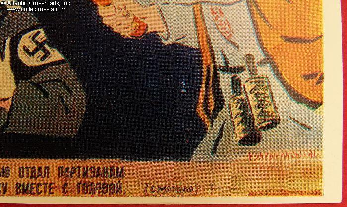 The size is continental standard 6" x 4", unmailable without a cover. Published by the Visual Arts Publishing House, circulation 32,000 copies, very small by Soviet standards. The poster was created by the famous Soviet trio of caricaturists working under the pseudonym "Kukryniksy" ("Кукрыниксы"). The text under the images is a short verse by the famous Russian Soviet poet Samuil Marshak glorifying WW2 Soviet partisans and their subterfuge activities behind the enemy's front lines. It says "At daytime the fascist ordered the farmers to take off their hats before him. At night the farmers took off his helmet together with the head". The name of the artist group is hand-signed in the lower right-hand corner of the image. The poet's initial and name is signed next to the second caption at the bottom.