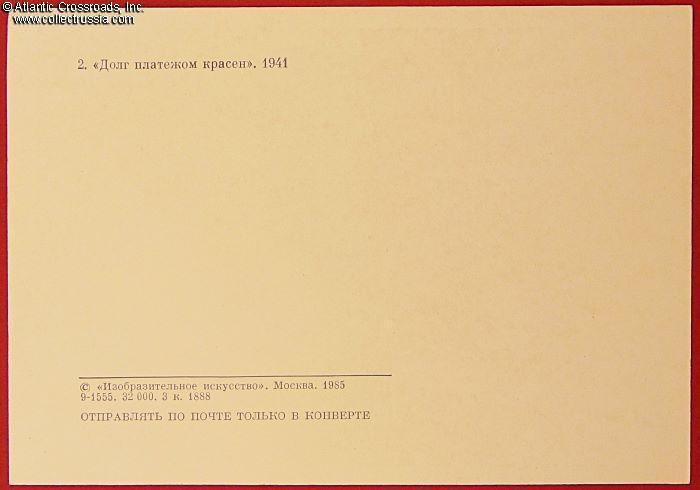 Postcard featuring the 1941 TASS Window poster Settling a Debt, by Kukryniksy, 1985.