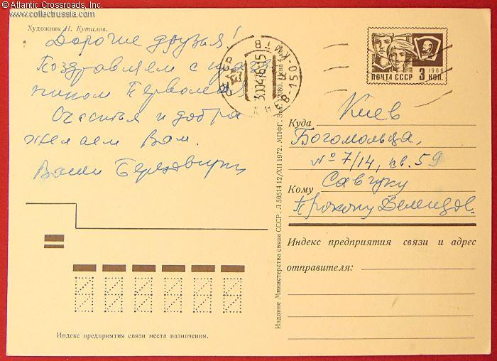The size is continental standard 6" x 4", with a pre-printed postal stamp canceled with a stamp of a Kiev post office branch. Published by the Ministry of Communications of the USSR, circulation unknown. The text on the obverse reads "Peace, Work, May. Happy Holiday!" The handwritten inscription on the verso contains well wishes from a family of friends on occasion of the holiday.
