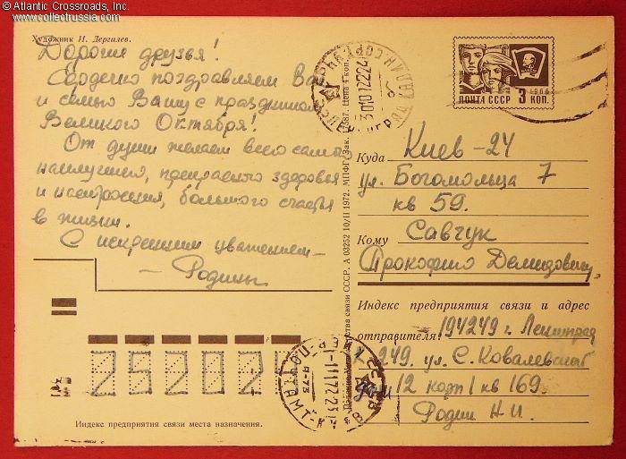 The size is continental standard 6" x 4", with a pre-printed postal stamp canceled by a post office branch in Leningrad. The cancel at the bottom of the verso was stamped at the destination, in Kiev, Ukraine. Published by the Ministry of Communications of the USSR, circulation unknown. The text on the obverse reads "Glory to October!" The inscription on the verso contains well wishes on occasion of the holiday.