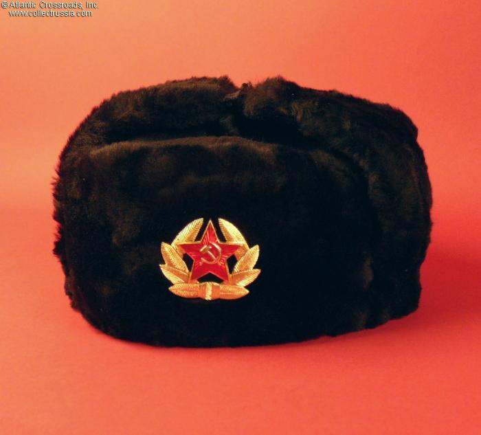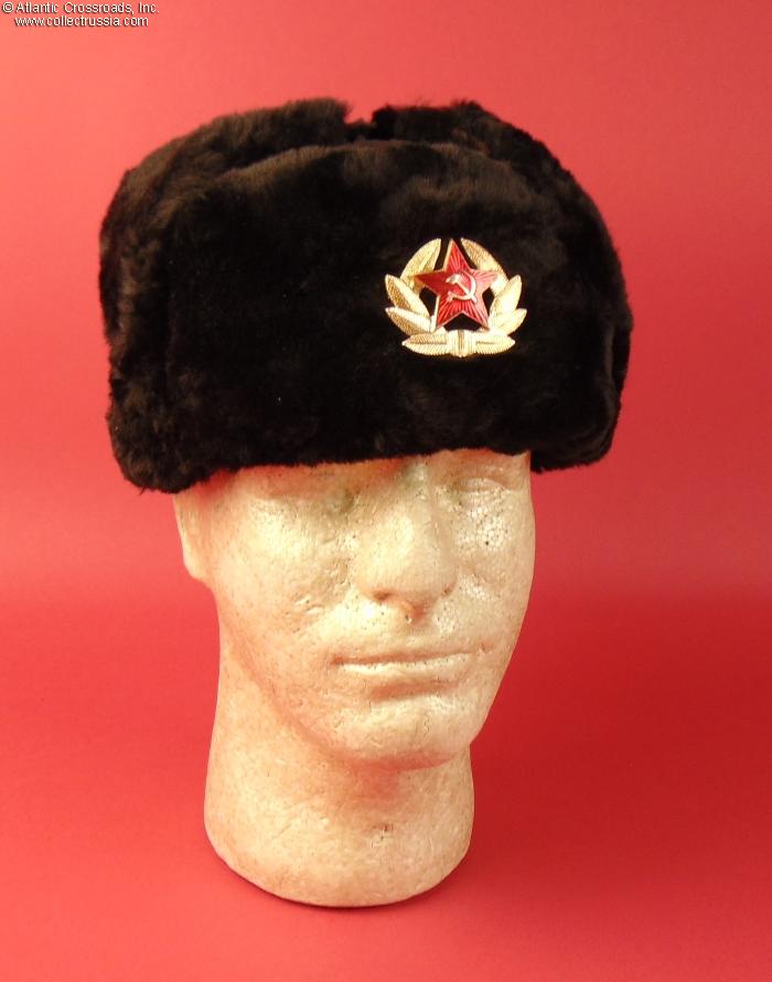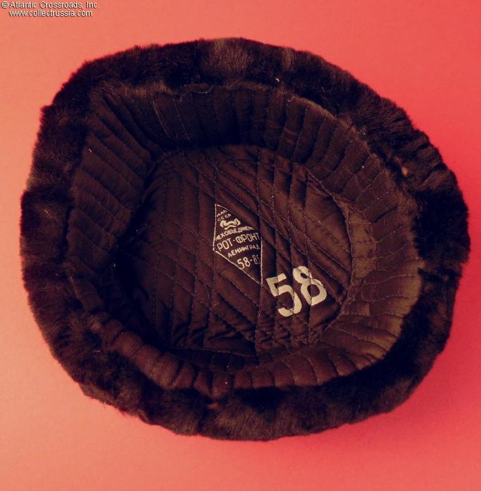 In dyed black lamb's fur with a woolen top and quilted cotton liner. Includes standard Navy EM hat badge. The liner has a stamped logo of the Leningrad's Rot-Front Fur Goods Factory of the USSR Ministry of Light (Consumer Goods) Industry, showing a (19)58 date of manufacture and Size 58 (US size 7 ¼). Additionally, there is a size 58 stamped separately in large numerals on the liner. There is also a Rot-Front Factory Minis manufacturer's tag attached with a string to the back on the exterior (complete with the official factory seal in tin). The tag specifies the materials used: