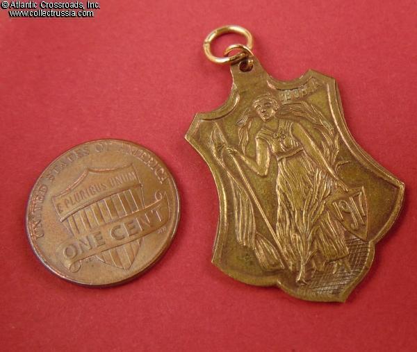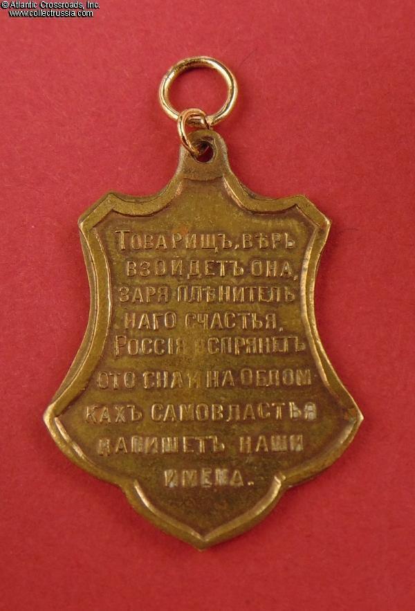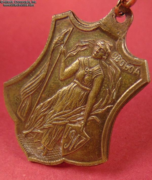 In brass, of less common shape (as opposed to the usual round jettons). Measures 34.7 mm in height (incl. eyelet), 25.6 mm in width; weighs 5.3 g without the connecting links. On the obverse is a female figure representing Russia holding a banner and shield with the date "1917". Along the top is a raised inscription "Freedom" with the last letter omitted, probably an inadvertent error on the side of the designer of the jetton.