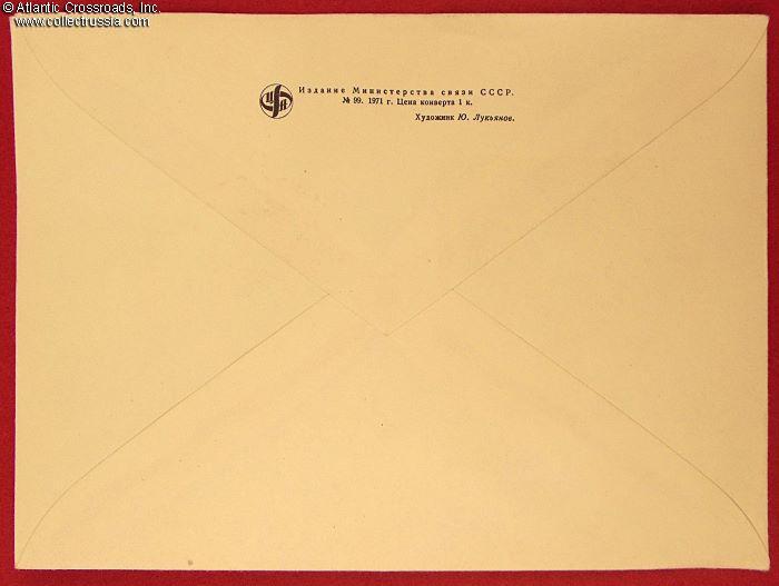The size is 6 ¼" x 4 ½", published by the Ministry of Communications of the USSR, circulation unknown. The large commemorative postal stamp is canceled with the First Day stamp issued by the Moscow Post Office, dated 5 April 1972. The lettering on the commemorative stamp reads "Automated station Mars-2, pendant on the planet, 27 November 1971." The image of the pendant shows the state emblem of the USSR and is inscribed with "Earth Mars USSR - 1971."