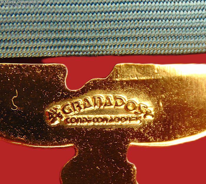 Silver gilt, 71.5 mm in height (incl. suspension bar), 51.5 mm in width, weighs 35.9 g. The cross is suspended from a 51cm-long silk neck ribbon with silk ties. The reverse center medallion and the 6 o'clock arm of the cross show abbreviation "FAC" which stands for Fuerza Aueroespacial Colombia ("Aerospace Force of Columbia"). The reverse of the eagle suspension has the word "Granados" in relief.