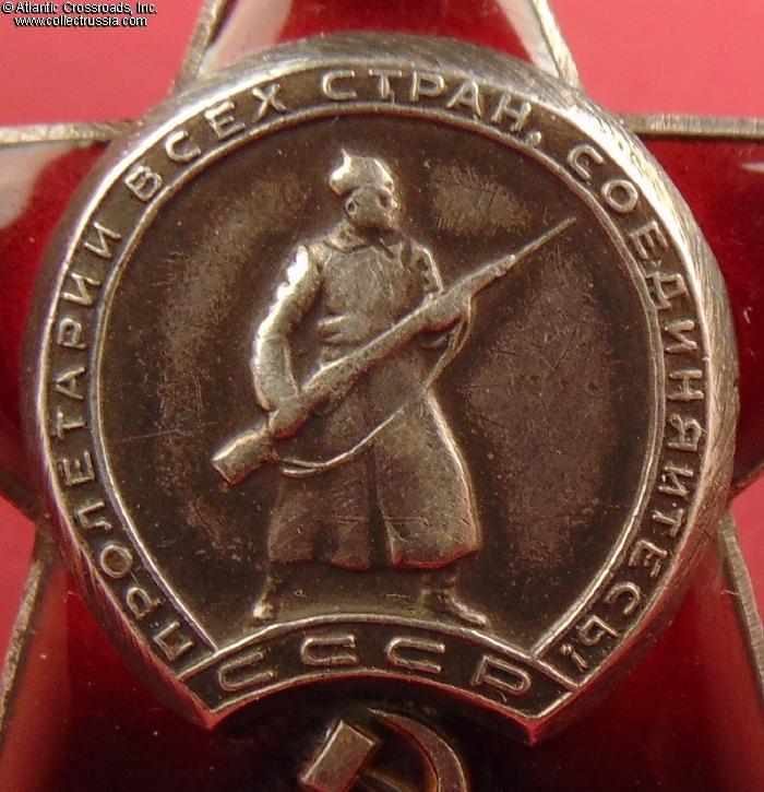 In excellent condition, absolutely outstanding for a pre-Patriotic War Soviet decoration. The enamel exhibits a beautiful luster and has only some minuscule contact marks that are barely noticeable, no chips, ribbing, flaking or repairs. The center medallion shows only a minimal wear to the high points; its details are well preserved and crisp. The reverse is nearly pristine, and there is a very attractive untouched toning to silver throughout. The screw post is full length, over 10 mm measured from its base, and comes with an original period screw plate, an early model in silver with a two-tier base.