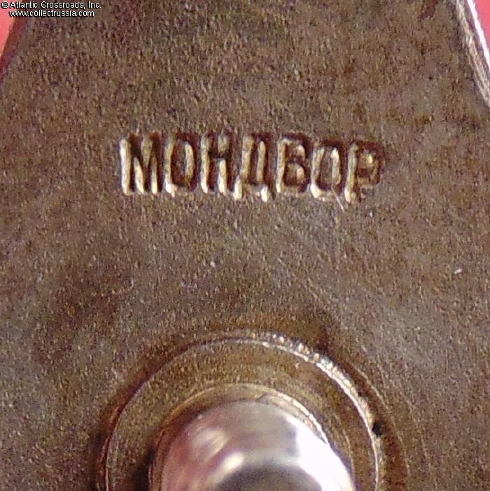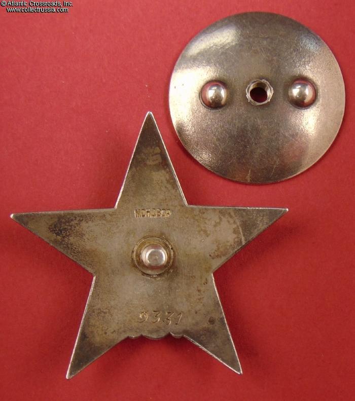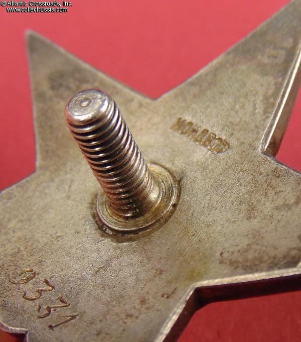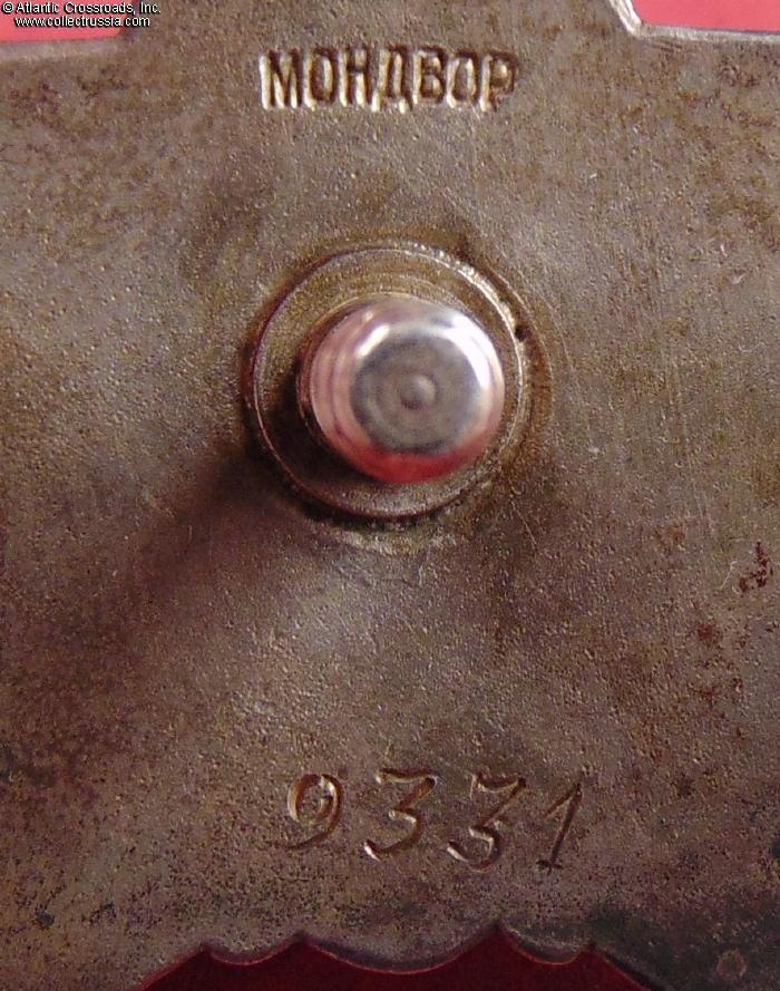 Silver, enamel. Measures 46.1 mm in height, 48.1 mm in width; weighs 28.1 g without the screw plate. Features a very slightly arched, nearly straight mint mark about 6 mm wide, stamped in a relatively small font of just over 1 mm in height. The dark cherry red enamel is of spectacular quality, characteristic of the "Mondvor" Red Stars. According to The Order of the Red Star by Durov and Strekalov, the currently known serial number range for this version is 8506 - 11800 (9016 - 11682 according to Mondvor.narod.ru). The order was manufactured in 1939 at the Leningrad M
