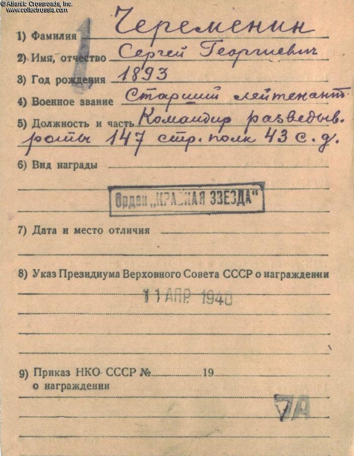 Sergey Cheremenin was born in 1893 and joined the Red Army in 1939, probably by enrolling in a military school. Later that year or in the early 1940, then already a commissioned officer, he took part in the Winter War with Finland as Commander of the Reconnaissance Company of the 147th Rifle Regiment, 43rd Rifle Division, 7th Army. In the early morning hours of 30 November 1939, his division, a part of the 19th Rifle Corps deployed on the western side of the Karelian Isthmus, was one of the first to attack Finland. The corps and entire 7th Army advance toward Vyborg (Viipuri) soon stalled however due in large part to the ineptitude of the Red Army command. The lack of progress on the isthmus precipitated the dismissal of the 7th Army Commander Vsevolod Yakovlev on 9 December.