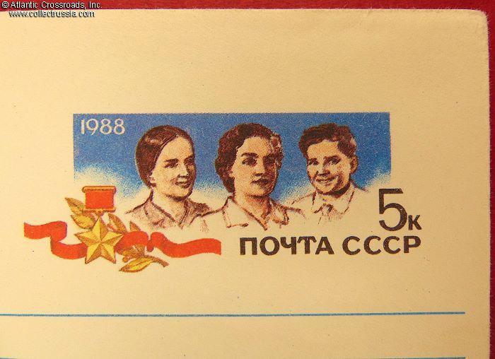 The size is 6 ½" x 4 ½", with a pre-printed postal stamp. Postally unused, published by the Ministry of Communications of the USSR, circulation unknown. The pre-printed special-issue commemorative postal stamp features the portraits of the three young women, V. Grizodubova, P. Osipenko, and M. Raskova, who made a non-stop flight from Moscow to the Soviet Far East, having covered 6,450 km (4,008 milies) in 26 hours and 29 minutes, setting a world record for women. Later, during the Patriotic War, Raskova formed and led the famous all-women light bomber regiment whose nighttime bombing ra