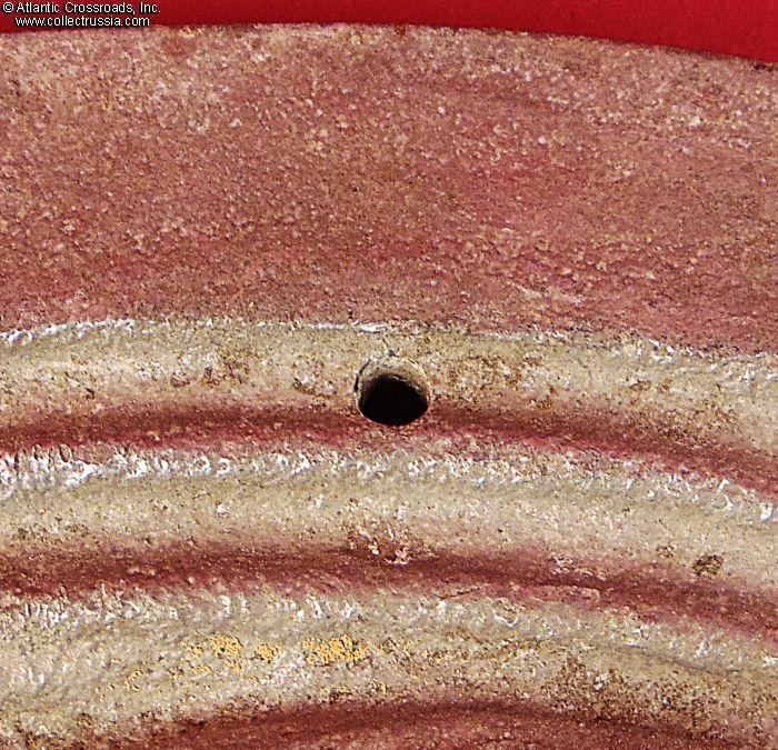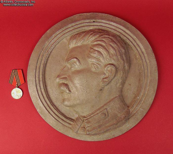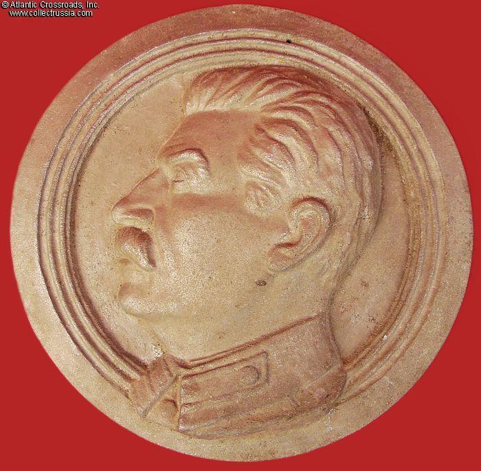 Measures 14.5" across, weighs a little over 3.5 lbs. High 3-D relief conveys Stalin's state-approved profile image. The plaque probably once decorated a government building. It has a 5-mm hole drilled at 12 o'clock to fit a mounting screw. Two protruding "studs" on the reverse ensured straight and level position of the plaque on the wall.