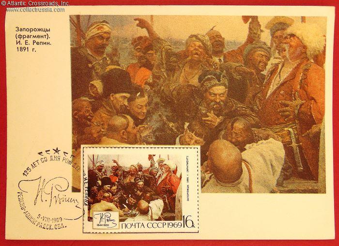 The size is 6 ½" x 4 ½", published by the Ministry of Communications of the USSR for the Soviet All-Union Philatelic Society, circulation 55,000. The obverse features a fragment of Repin's famous 1891 painting Reply of the Zaporozhian Cossacks. The special postal stamp with the same image is stamped with the First Day Cancel, issued by the Post Office of Repino, Leningrad Region, dated 5 August 1969 and showing Repin's facsimile in the center.
