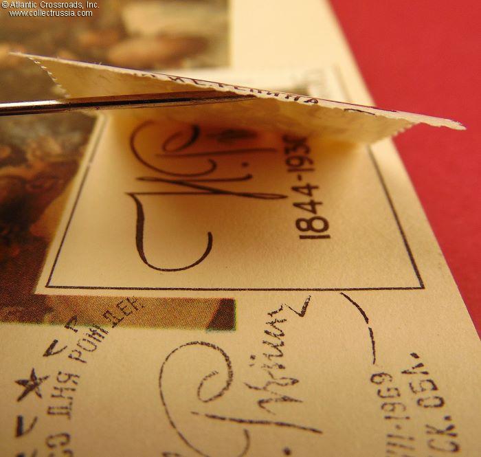 In excellent condition. The postal stamp is glued to the postcard only by its right-side half. However, it is wear-free and provides an opportunity to glimpse at its placeholder which, as it turns out, also has Repin's facsimile and years of life, thus precisely repeating everything depicted in the stamp. The upper left-hand corner of the obverse is slightly and unobtrusively creased. The verso is mostly clean, showing just a bit of storage wear.