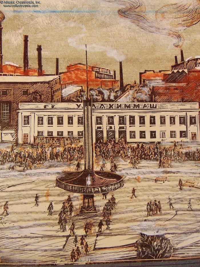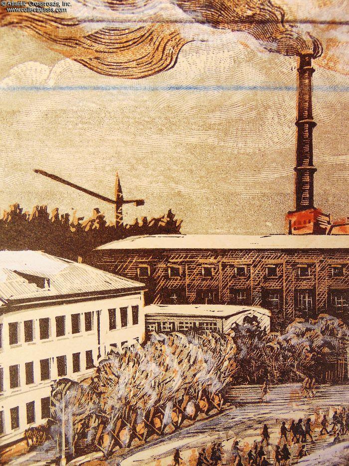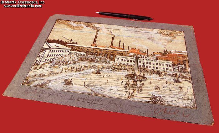 The image measures 11 ¼" x 17", total size with the backing is 13" x 8 ¾". On thick drawing paper affixed to a cardboard backing. The artwork depicts the main entrance to URALKHIMMASH, the Ural Chemical Machine Building Plant in Yekaterinburg in Western Siberia, just east of the Ural Mountains. A river of people flows into the maw of its doors, about to be swallowed by the smoke-belching giant; the time is apparently close to the beginning of a work shift.