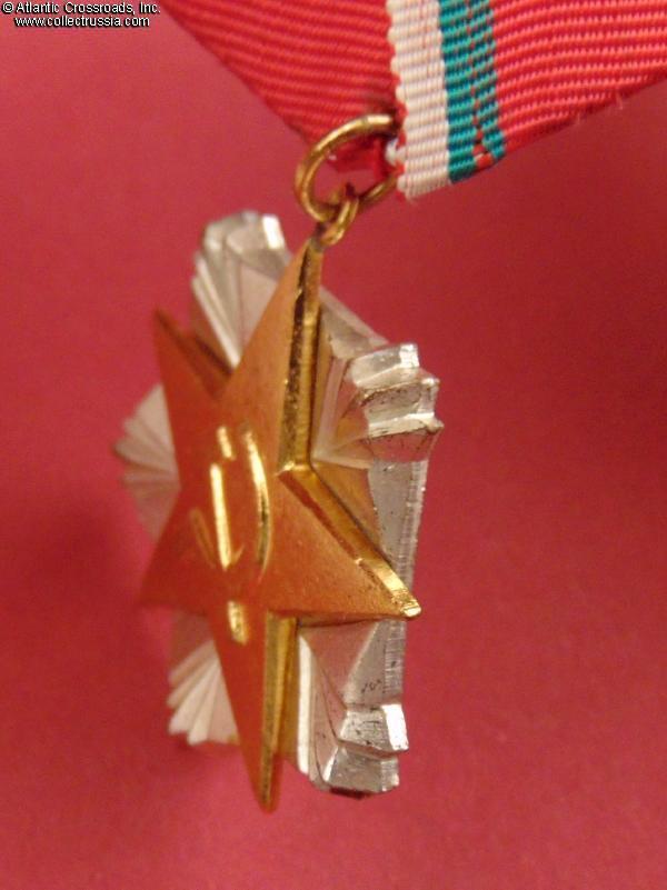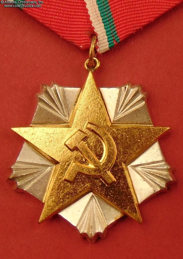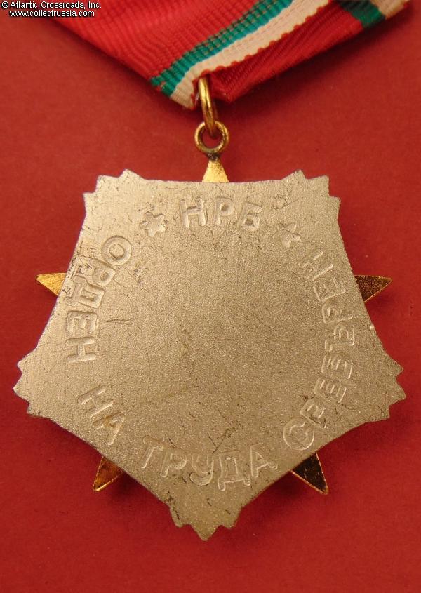 In gilded and silver-plated brass, measures 44.5 mm height incl. eyelet x 40.1 mm in width. A late version featuring rays of the starburst extending beyond the pentagon border. Nicely sculptured massive medallion. The reverse has a stamped inscription "Order of Labor in Silver, NRB (People's Republic of Bulgaria)".