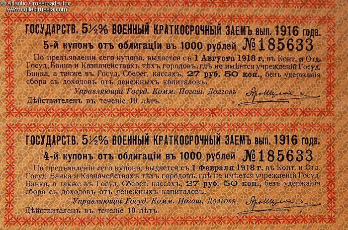 Measures 7 ¾" x 11 ¾"; two watermarked pages, with p.2 containing 20 redemption coupons of which 18 are still present. This is Imperial Russia's short-term State War Bond in 1,000 ruble denomination, guaranteeing a 5 1/2% interest rate. Series I, issued against authorized capital of 2,000,000,000 rubles, with fully attached redemption coupon fold-out which has eighteen coupons remaining. The certificate is finely engraved and printed on watermarked bank note paper, with the Imperial Russian double-headed eagle at top center. These bonds were issued to help finance the war effort in Worl