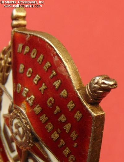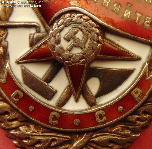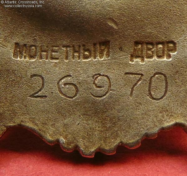 Silver gilt, enamels; measures 40.1 mm in height (from the top of the flag to the bottom of the wreath), 36.1 mm in width; weighs 23.5 g not including the screw plate. Features "geometric" style of the serial number engraving which is characteristic for its serial number range. According to Durov and Strekalov, this piece was manufactured in the early part of 1942 by the Krasnokamsk Mint. /V. Durov, N. Strekalov The Order of the Red Banner, p. 126/.