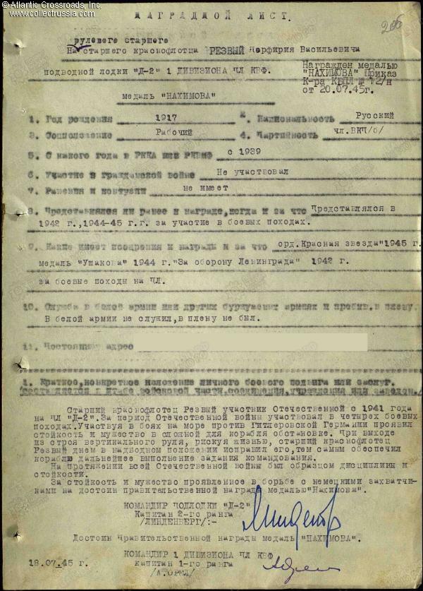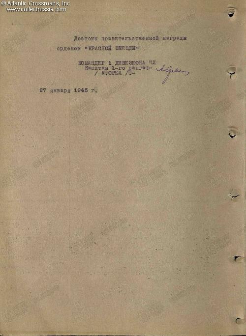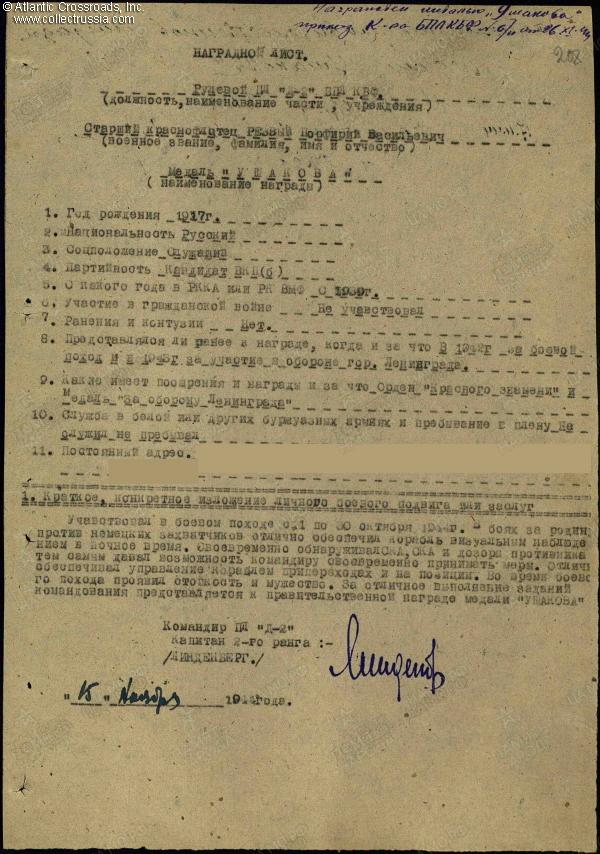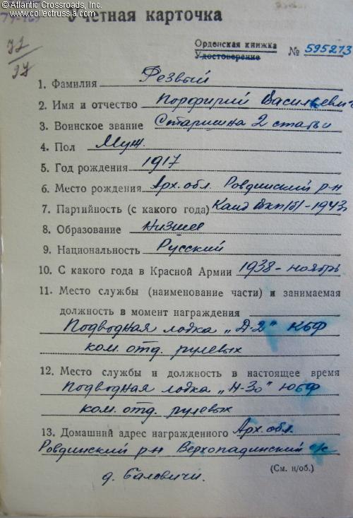 Research Materials: b/w copy of the award record card, award commendations for all four wartime decorations, and relevant part of the award decree for the Order of the Red Banner. Ample information about the D-2 and many photos can be found on a number of Russian- language websites such as ru.wikipedia.org and sovboat.ru.
