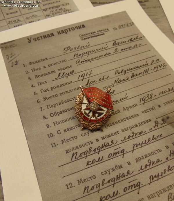 Order of the Red Banner, Type 2, Variation 3, Sub-variation 1, #26970, awarded on 14 November 1942 to Senior Seaman Porfiriy Rezvyi (Порфирий Васильевич Резвый), senior helmsman of submarine D-2, Baltic Fleet.
