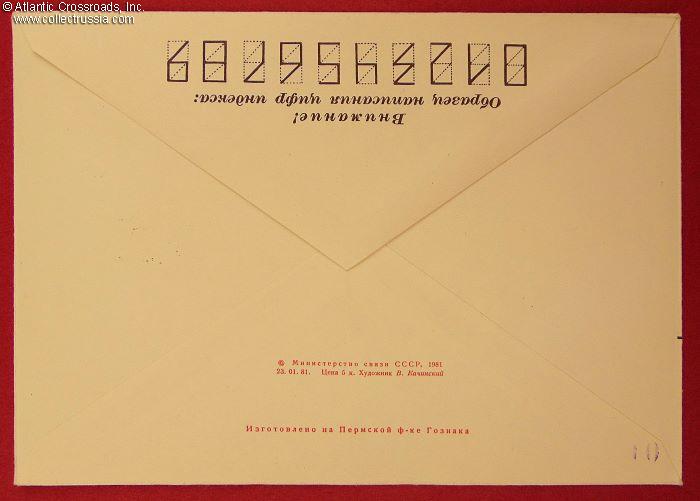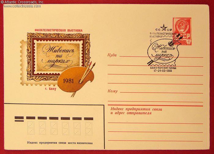 The size is 6 ¼" x 4 ½", published by the Ministry of Communications of the USSR, circulation unknown. The pre-printed postal stamp is canceled with the First Day stamp issued by the Baku Post Office and dated with the dates of the exhibition, 17 - 24 May 1981.