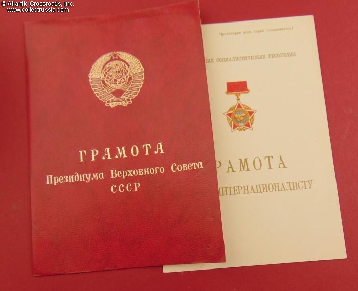 Large document enclosed in 6 1/4" x 8 3/4" red folder with gold lettering on the front cover. Shows an image of the badge in color and the citation from the Soviet government "for courage and military valor shown during the execution of international duty in the Republic of Afghanistan." At the bottom of the citation page are facsimile signatures of the Chairman of the Presidium of the Supreme Soviet of the USSR Mikhail Gorbachev and Secretary of the Presidium Menteshashvili. Also shows a typographically printed seal of the Supreme Soviet and the 20 December 1988 date of the award decre