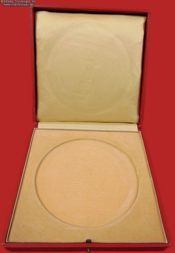 The plaque comes in its original fitted presentation box, also marked with the crossed swords of Meissen Porcelain on the lid. The box is in sturdy cardboard finished in red imitation-leather textured paper on the outside. The lid is lined in padded gold-colored silk; the fitted space is finished in short-pile synthetic velvet. The box manufacturer's mark is embossed in the corner on the bottom of the box.