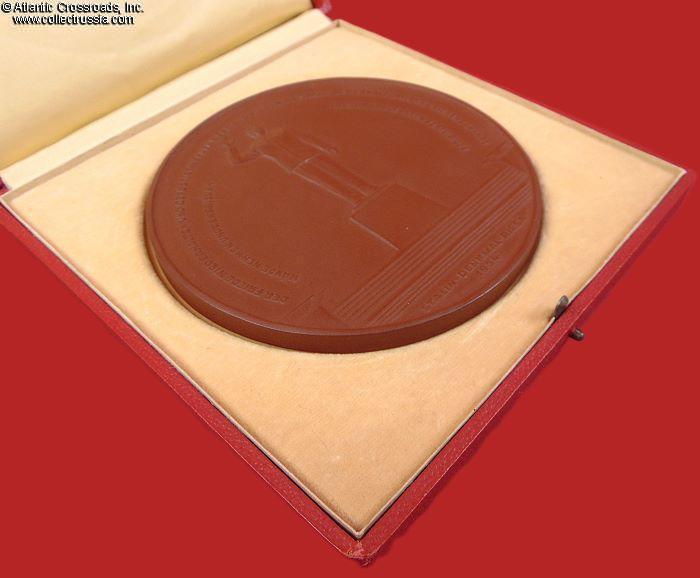 The plaque measures 12 cm across, approx. 7 mm thick, in brown porcelain. The artwork is an image of the monument to Stalin erected in the town of Riesa, Meissen District, Saxony. In 1954, it was perhaps one of the last expressions of Stalin's personality cult. The lettering running along the rim of the plaque is one of Stalin's Orwellian masterpieces, reading "Peace will be preserved and strengthened if the people take the cause of preserving peace into their own hands and defend peace to the utmost." The reverse is plain, with the raised trademark of Meissen Porcelain in the center.