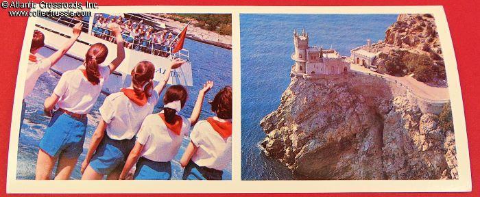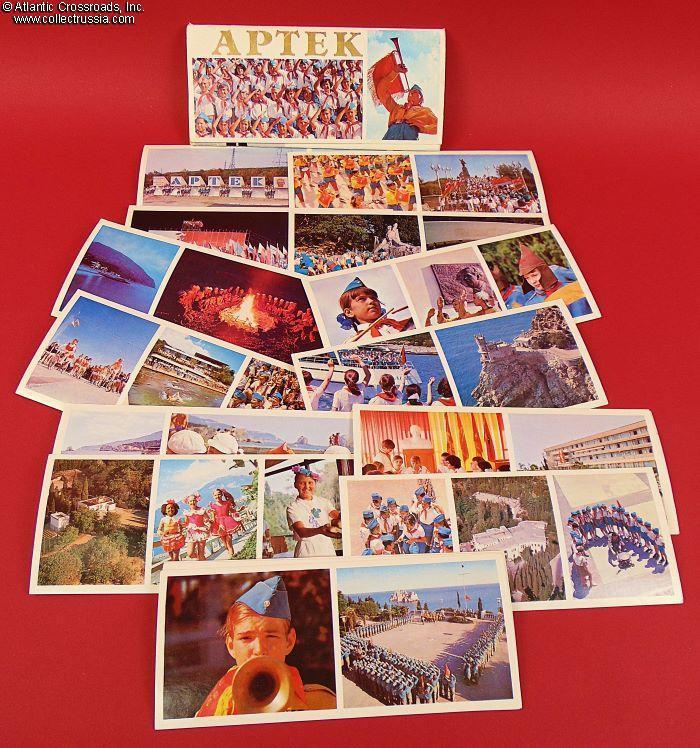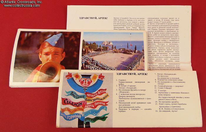 The postcards measure 8 ¼" x 3 ½", published by the PLANETA Publishing House, circulation 300,000. Each postcard contains two color photos propagandizing the blissful pastimes and activities in Artek, a palatial complex of five summer camps for the Lenin's Young Pioneers organization on the Crimean shore of the Black Sea. Among hundreds, perhaps thousands of Young Pioneer summer camps across the Soviet Union, there was only one Artek, the Showboat of them all. To be awarded with a month-long stay in Artek was the dream of each and every schoolkid of the Young Pionee
