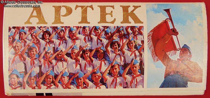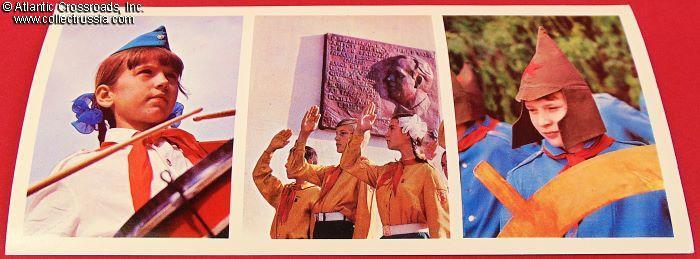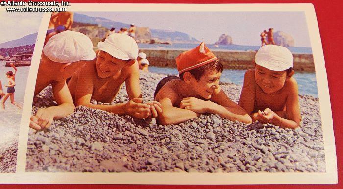 The postcards measure 8 ¼" x 3 ½", published by the PLANETA Publishing House, circulation 300,000. Each postcard contains two color photos propagandizing the blissful pastimes and activities in Artek, a palatial complex of five summer camps for the Lenin's Young Pioneers organization on the Crimean shore of the Black Sea. Among hundreds, perhaps thousands of Young Pioneer summer camps across the Soviet Union, there was only one Artek, the Showboat of them all. To be awarded with a month-long stay in Artek was the dream of each and every schoolkid of the Young Pioneer age (10 - 14 years old). Two main roads let to Artek: winning the lottery of a quota representing a Soviet republic, or having your daddy or mommy high enough in the Communist Party or Soviet Government apparatus. Plus, a sprinkle of kids from other communist countries to show off the international brotherhood of socialism.