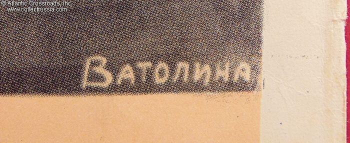 Very large format measuring 26" x 37", published by the ART Publishing House, circulation 500,000. The artist's name, N. Vatalina, is misspelled at the lower left-hand corner under the image. Her hand signature, presumably spelled correctly, Vatolina, is in the lower right-hand corner of the image. The lettering under the graphics reads "Long Live the Great Party of Lenin-Stalin, Brain, Honor, and Conscience of Our Epoch!" The tome of "History of the All-Union Communist Party (of Bolsheviks)" the fanatic with the banner is holding next to his heart quite possibly holds the world