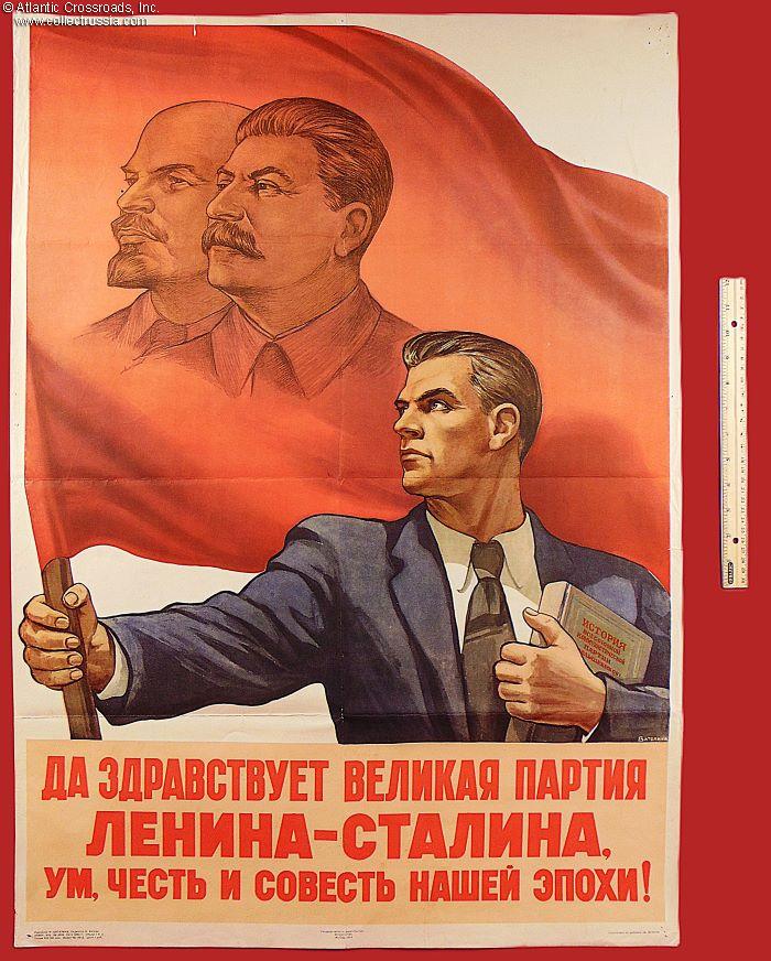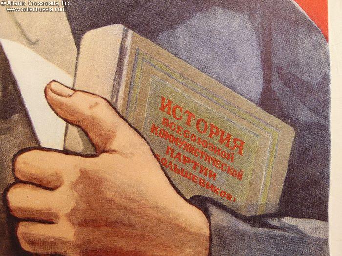 Very large format measuring 26" x 37", published by the ART Publishing House, circulation 500,000. The artist's name, N. Vatalina, is misspelled at the lower left-hand corner under the image. Her hand signature, presumably spelled correctly, Vatolina, is in the lower right-hand corner of the image. The lettering under the graphics reads "Long Live the Great Party of Lenin-Stalin, Brain, Honor, and Conscience of Our Epoch!" The tome of "History of the All-Union Communist Party (of Bolsheviks)" the fanatic with the banner is holding next to his heart quite possibly holds the world record of the number of editions a book underwent. Originally published in 1938, it underwent over 300 reprints by 1958 with changes to fit the ever fluid and constantly re-written official Party view of itself, its past, and the country it ruled. The simplified and generalized version of the slogan in this poster, "The Party is the Brain, Honor, and Conscience of our Epoch," continued to plague the Soviet people from the walls of buildings and newspaper pages all the way until the bitter end of the Soviet Union.