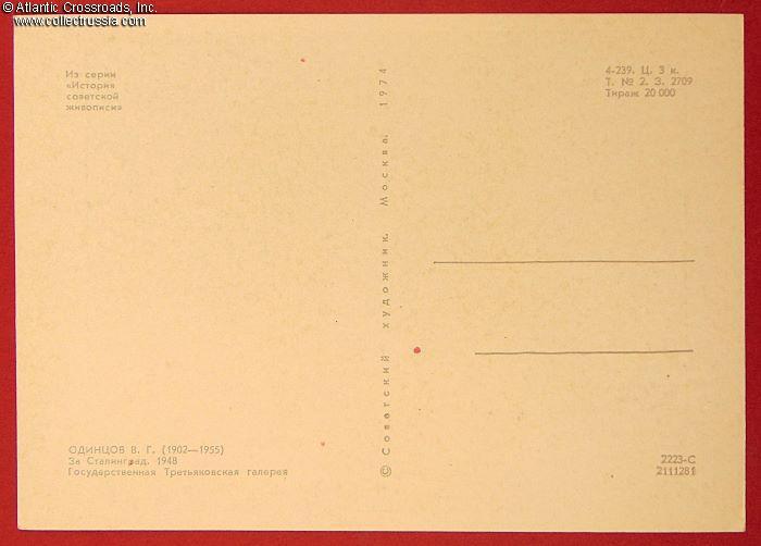 The size is continental standard 6" x 4", postally unused and unmarked, published by the Soviet Artist Publishing House, circulation 20,000, quite small by Soviet standards. Part of the series History of Soviet Painting. The artwork is an offset print of the1948 painting by V. Odintsov, on exhibit in the State Tretyakov Gallery in Moscow.
