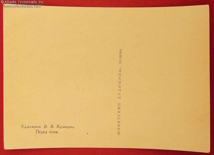 The size is continental standard 6" x 4", unmailable without a cover, published by the Soviet Artist Publishing House, circulation unknown. The artwork is an offset print of a painting by V. Kuznetsov. According to Soviet propaganda during and after WW2, Red Army soldiers often applied for membership in the Communist Party before going into battle out of their wish to die as Communists if they do not survive.
