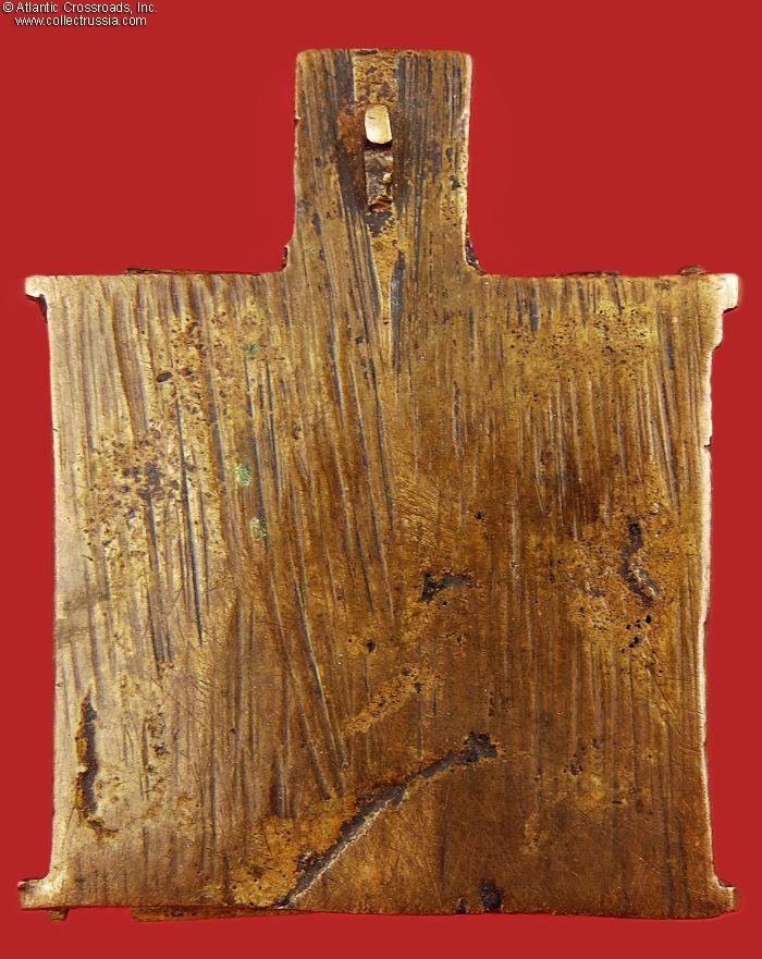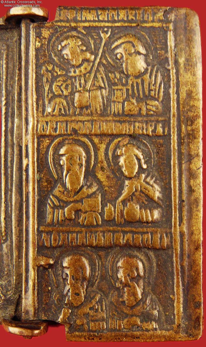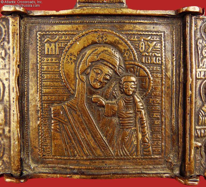 In bronze, weighs nearly 2 oz. The side panels measure 2" x 1" each, the middle panel is 2" square. The central panel depicts the Virgin Mary of Vladimir and Child Christ, with the image of Christ-Not-Made-By-Hand above. The side panels feature various saints, apostles, and archangels. The reverse is unmarked and has the remaining part of a broken loop for threading a cord to wear the icon on your chest.