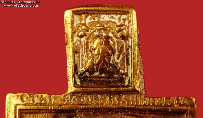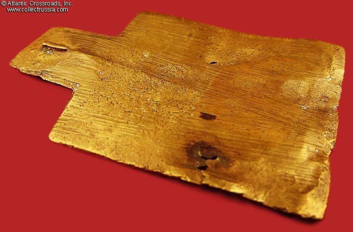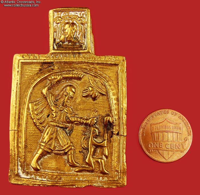 In bronze, measures 62 x 41 mm, weighs 19 g. Saint Nikita the Martyr is depicted under the image of Christ-Not-Made-By-Hand, beating the demon who had been enticing him to give up his Christian faith and accept paganism. Believers pray to him asking for help in strengthening their faith, for healing, getting rid of bad habits and addictions, and for lifting curses. The inscription on the upper margin reads "Saint Martyr Nikita."