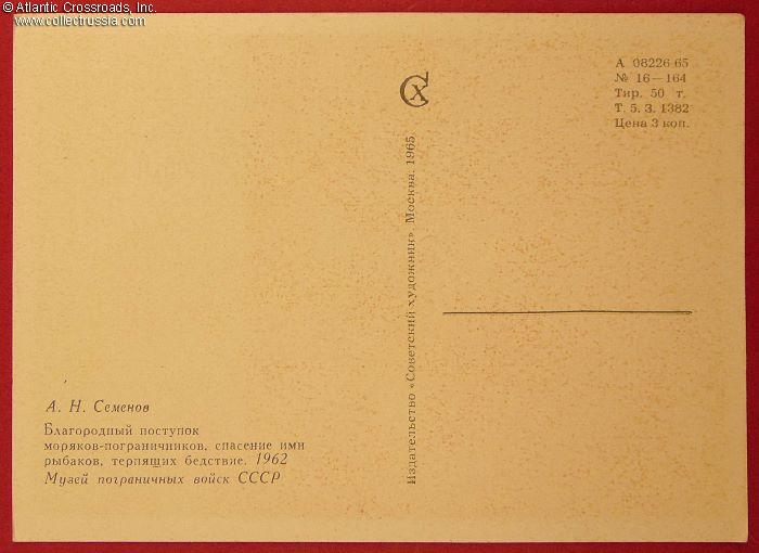 The size is continental standard 6" x 4", postally unused and unmarked, published by the Soviet Artist Publishing House, circulation 50,000, quite small by Soviet standards. The artwork is an offset print of A. Semenov's 1962 painting.