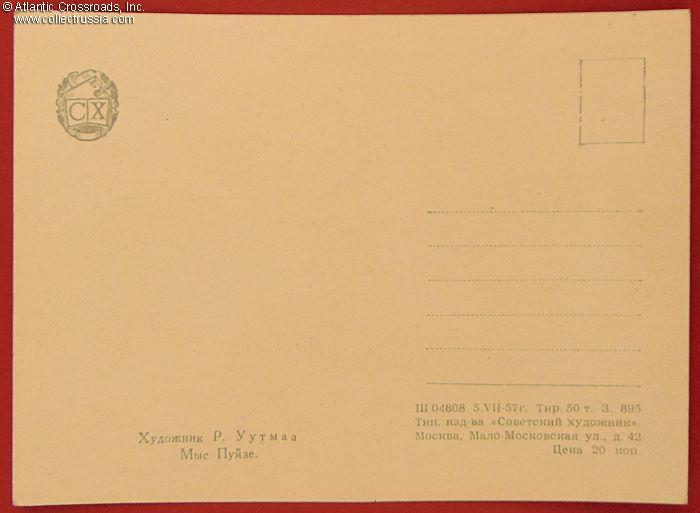The size is continental standard 6" x 4", postally unused and unmarked, published by the Soviet Artist Publishing House, Moscow, circulation 50,000, quite low by Soviet standards. The artwork is an offset print of Richard Uutmaa's 1956 painting.