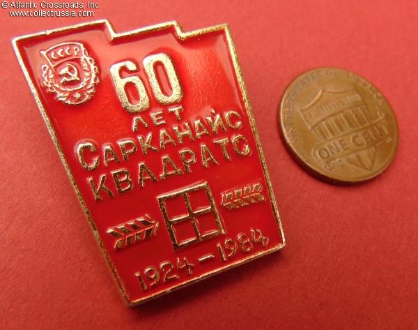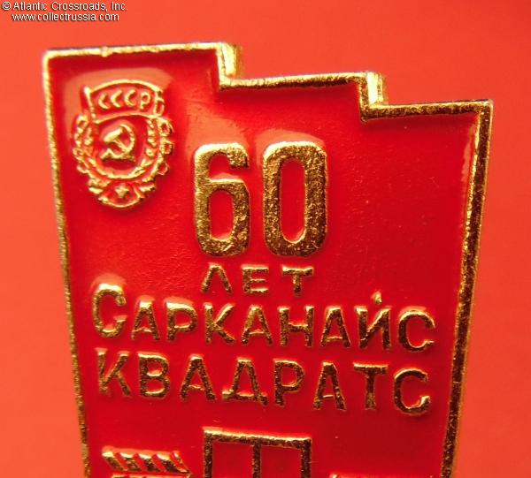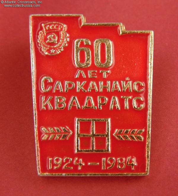 Badge in Commemoration of the 60th Anniversary of the Sarkanais Kvadrāts Rubber Goods Factory, Riga, Latvian SSR, 1984.