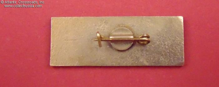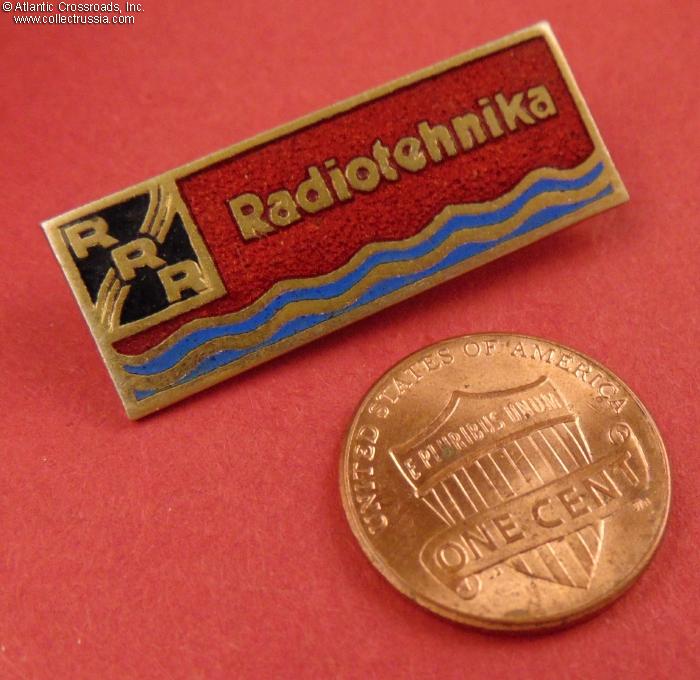 In nickel-plated brass and enamels; 12.8 x 34.1 mm. A stylized national flag of Latvian SSR with the Latvian inscription "Radiotehnika" and the factory logo with the abbreviation "RRR" (Rīgas Radio Rūpnīca). A very well-made piece.
