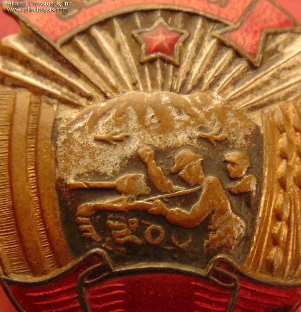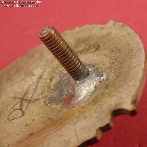 Early type in silver-plated and gilded brass and enamels; measures 37.9 mm tall x 31.4 mm wide; weighs 15.5 g without the screw plate. This version of the badge is almost certainly of Soviet manufacture.