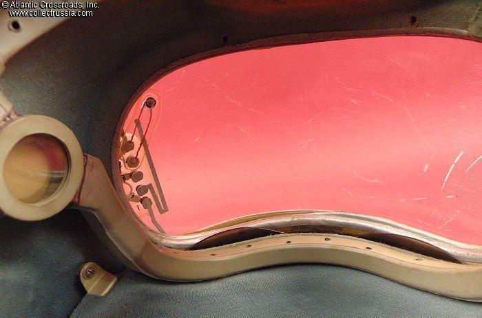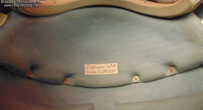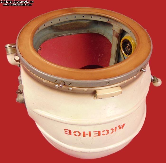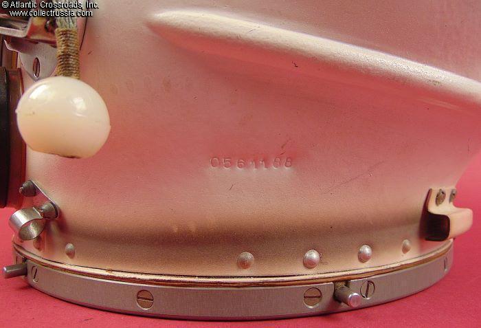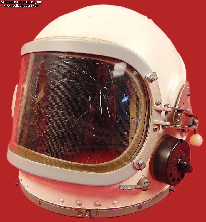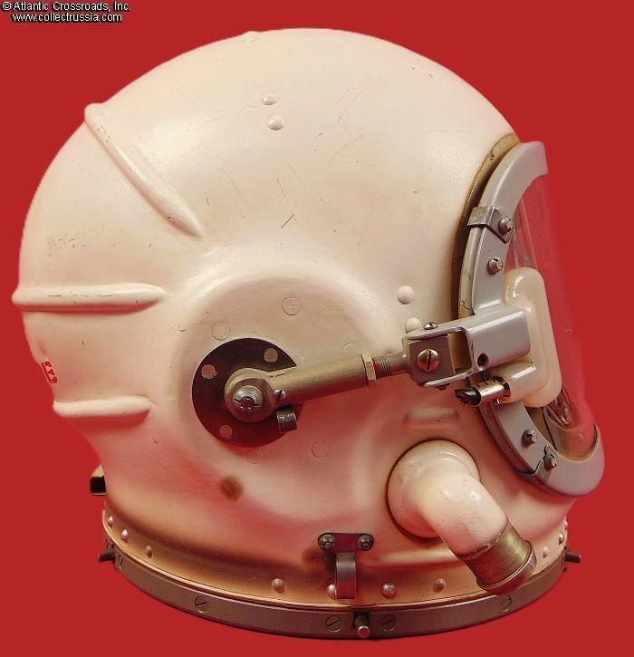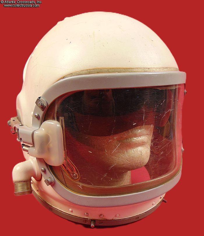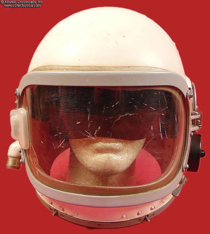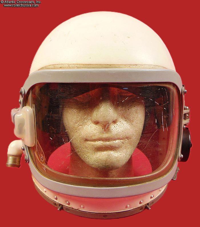 Big, heavy-duty "bone dome" characteristic of Soviet aviation memorabilia. Retro-futuristic look reminiscent of "Buck Rogers". Weighs 4 lbs. Complete with heated glass faceplate, flip-down sun visor, and collar seal. The back of the helmet is stenciled with the name of the pilot, АКСЕНОВ ("Aksenov"). [Immediately, the Soviet cosmonaut Vladimir Aksenov comes to mind. After all, most of the Soviet cosmonauts used to be Air Force pilots prior to being selected for space flights. Vladimir Aksenov did graduate from the Air Force Academy. His specialty was engineering but he could have some pilot training or flying experience, including in high-altitude flights. He spent almost 12 days in space as flight engineer on Soyuz 22 and Soyuz T-2 in 1976 and 1980, respectively, and made a total of 189 revolutions around the Earth.]