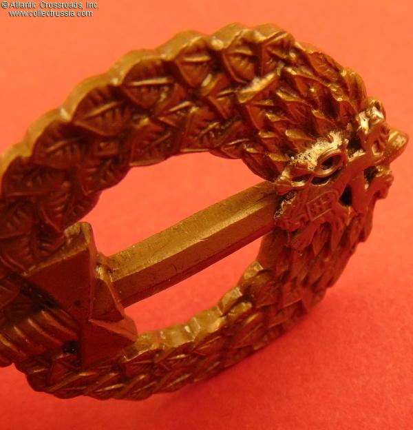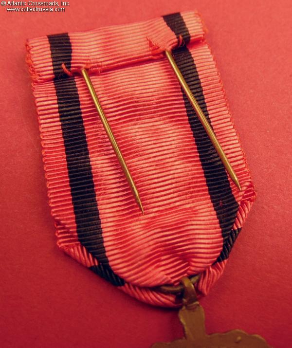 Excellent condition. The details are perfect and crisp; the silver finish on the emblem is intact. Comes complete with original jump ring; perfectly preserved, clean old ribbon; and period attachment pin.