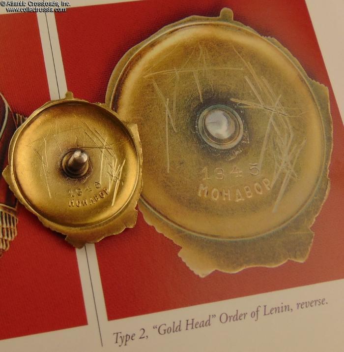 Solid 18 K gold, enamels; measures 38.8 mm in height (from the bottom to the top edge of the banner, not including the flagpole finial), 38.4 mm in width; weighs 26.8 g without the screw plate. Variation 2 featuring double-tier screw post base and approx. 4 mm-thick screw post. This early version of the Variation 2 had extremely thin and fragile silver plating which led to it being separated into its own type according to the McDaniel classification. Note that the Orders of Lenin with serial numbers just above 1300 and up had more durable silver plating on the Lenin's bust (so-called "Silver Heads"). Although currently accepted classification by Durov considers both "Silver Head" and "Gold Head" versions a single type, there is a mentioning of the difference in manufacture between the two on page 46 of the reference guide Order of Lenin. Order of Stalin by V. Durov.
